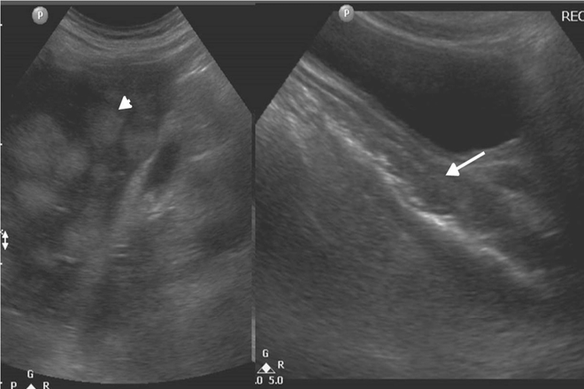 Ecográficamente, puede ir desde ecogénico hasta anecoico, dependiendo del estadio. El absceso en las primeras etapas suele ser sólido, conforme llega a la necrosis y licuefacción el absceso de observa de bordes irregulares con contornos delimitados. Las lesiones que son más ecogénicas se deben a la presencia de gas dentro de la cavidad del absceso, este gas produce sombra acústica o reverberaciones. Cuando las lesiones son hipocoicas representan necrosis y licuefacción, con el doppler muestra flujo en la periferia.