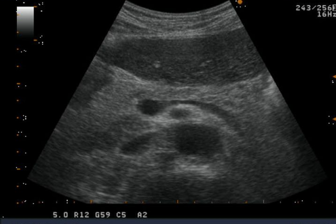 Pancreatitis aguda: cambios focales o totales, la pancreatitis focal en la cabeza puede dificultar el diagnóstico versus un tumor de cabeza de páncreas, o imágenes hipoecoicas.